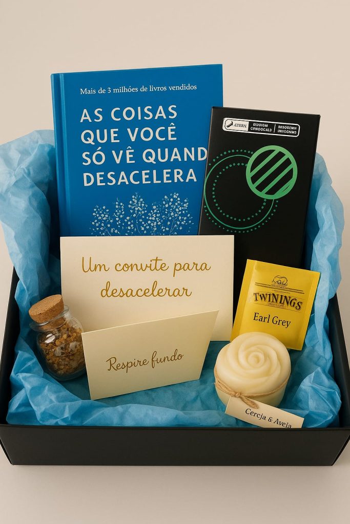 🌸 A cada mês, uma caixa temática diferente, pensada para despertar os 5 sentidos: visão, olfato, tato, paladar e audição, promovendo momentos de calma, relaxamento e autocuidado.